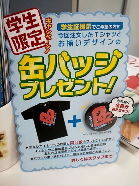 生徒手帳や学生証を提示して頂いたお客様に、今回ご注文して頂くTシャツ(その他ウェア可)と同じ柄・同じ数の缶バッジを、もれなくプレゼントさせて頂きます!