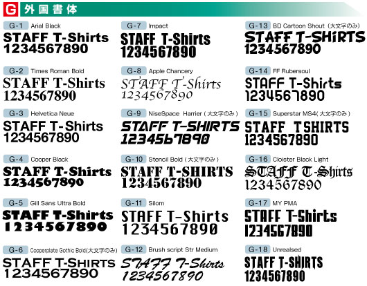 ![]() ※プリントしたい書体を上記からお選び下さい。 注文・データ作成に関するご注意 ※お客様によるTシャツやその他ボディの持ち込みのプリントは対応しておりませんのでご了承下さい。 ※版権及び著作権等に関する一切の責任はお客様に帰属しますのでご注意ください。 ※郵送の場合のUSBメモリやCD-ROMは、商品に同封して返却致しますが、配達時の破損等については責任を負いかねますのでデータのバックアップは必ず行ってください。 ※ご注文時には全員分の背番号と名前リストを半角英数字でお送り下さい。 製品に関して ※プリント部分に直接のアイロン掛けはおやめ下さい。 |