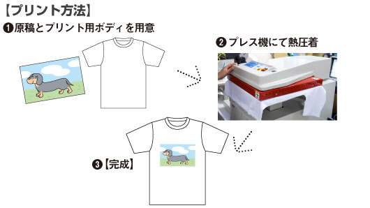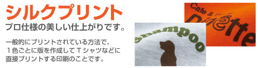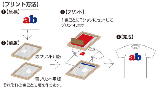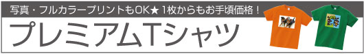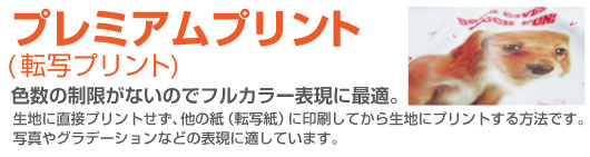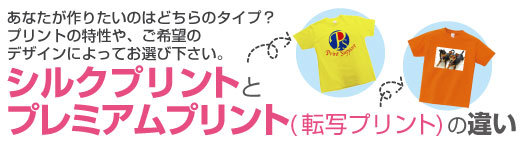 ■特徴■ ・プリントする色ごとにそれぞれの版が必要です。 ・濃色のボディに沈みがちな薄い色も、発色よくプリントすることができます ・蛍光色やゴールド・シルバーなど特殊なプリントも可能です。 ・色あせが起こりにくく、洗濯後の耐久性があります。 ・色数の少ないデザイン(1色~4色)で、濃淡(グラデーション)のないもの。 ・納期は校正のやり取りが終わってから10日~2週間前後です(繁忙期にもよる) ・プリント枚数が多い場合は、一番コストが安いです。 (沢山刷れば刷るほど1枚あたりの金額が安い!) シルクプリントで作りたい!という方は・・・ ■特徴■ ・写真や4色以上のフルカラーのデザイン、濃淡(グラデーション)のあるプリントが可能です。 ・当店のプリンターで出力するため、お客様がお持ちいただいた原稿と、多少色変わる場合があります。 ・お店で直接作るので、シルクプリントよりも短納期です。(繁忙期・Tシャツの入荷状況による) ・版代がいらないので、小数枚のプリント向きです。 プレミアムプリント(転写プリント)で作りたい!という方は・・・